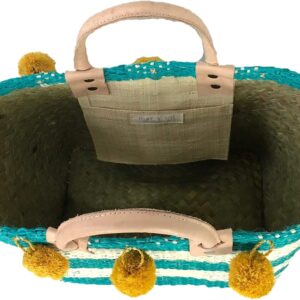 This Mar Y Sol Aqua Multi Gingham Print Basket Tote is the perfect blend of style and function. Its eye-catching gingham design and cheerful pom-poms add a fun, summery vibe to any look. The spacious interior, complete with a handy slip pocket, keeps you organized while the durable leather handles ensure comfortable carrying. This beautiful and practical tote is your ideal companion for all your summer adventures—from beach days to shopping sprees. Enjoy the effortless style and lasting quality of this handcrafted bag.