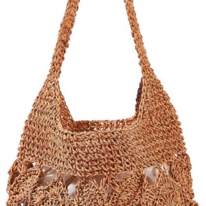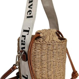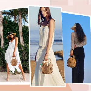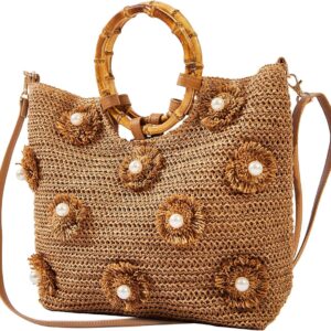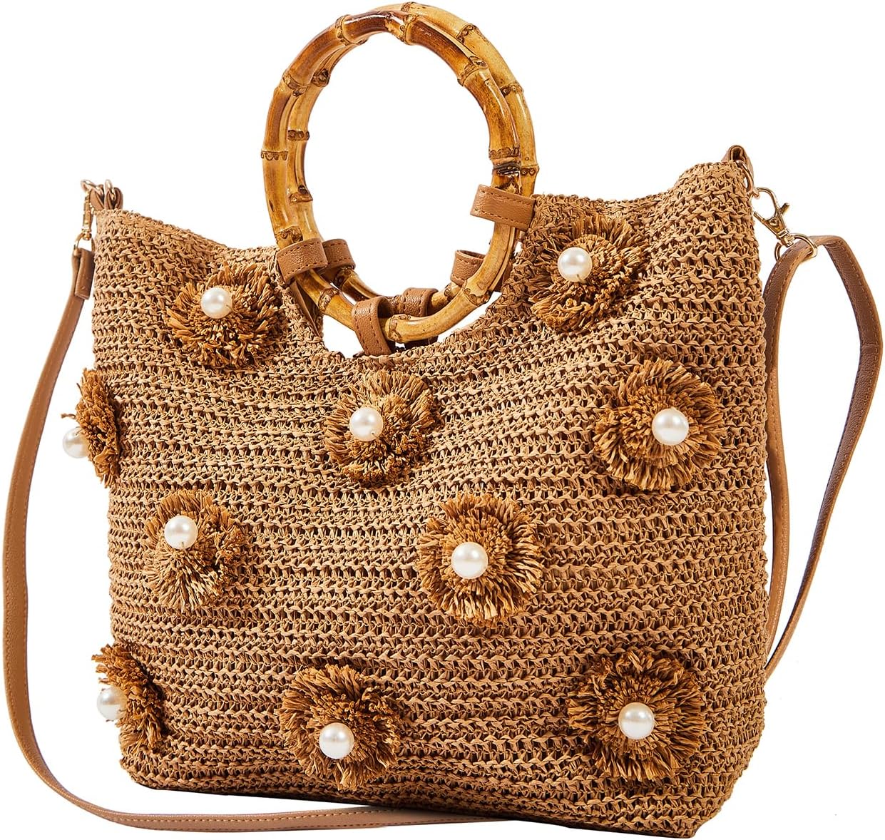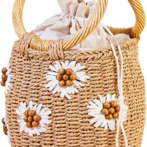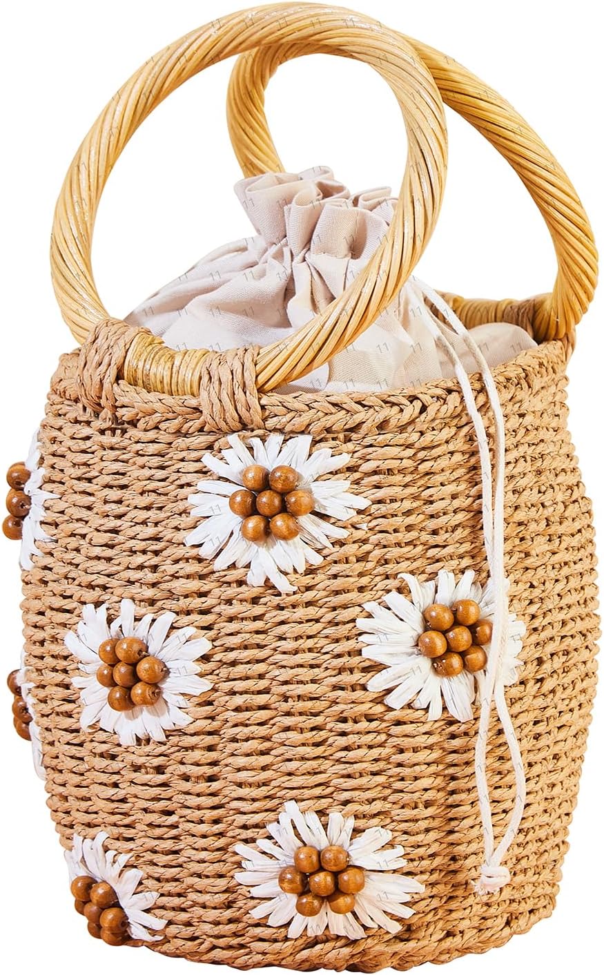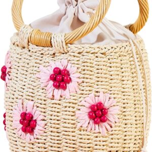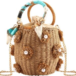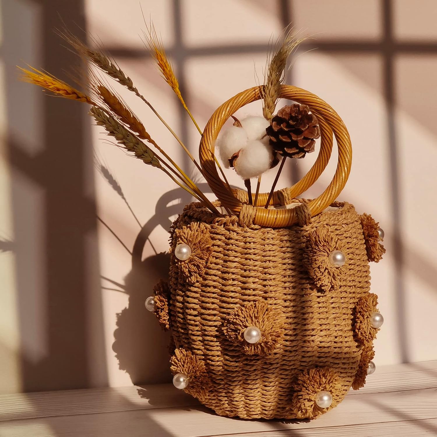 NIBD Flower Pearls Rattan Tote Bag Summer Beach Drawstring Straw Bucket Bag Diamonds Woven Handbag