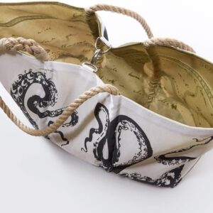 This dramatic tote features an illustration from the official expedition report of the HMS Challenger, the 1872-76 scientific cruise that established the field of oceanography. Our octopus is, printed with ink as dark as his own; on sails that have known the sea. The lining is printed with Charles Darwin’s handwritten notes from The Origin of Species, for added intrigue.
